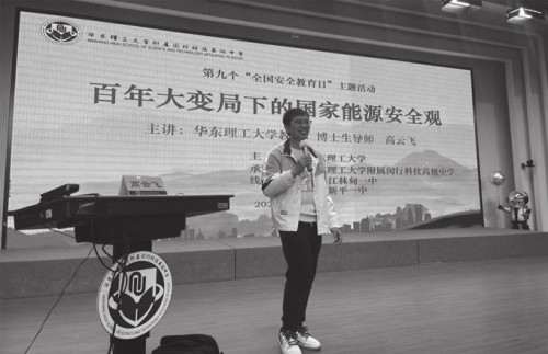 记者 刘昕璐 受访者图 在“总体国家安全观”提出十周年暨第九个全民国家安全教育日之际,4月13日至15日,华东理工大学团委、新时代国家安全研究中心联合相关学院,结合学校专业特色,邀请能源安全、社会安全、信息安全等领域专家学者,为四地八校的青少年同上一堂必修课,探索“大中小”一体贯通的总体国家安全观教育立体化格局,让国家安全的理念深植心间。 华东理工大学附属小学、附属闵行梅陇实验学校、附属闵行科技高级中学、附属奉贤曙光中学和上海市黄浦区卢湾一中心小学以及华理对口帮扶的云南省寻甸县仁德第一小学,县中托管帮扶项目对口的云南省新平县第一中学、黑龙江林甸县第一中学等四地八校,采取线上线下相互融合的形式,围绕“总体国家安全观 非凡成就10周年”主题,组织开展了“总体国家安全观教育进校园”活动,让国家安全教育进校园、进课堂、进头脑。引导学生担当时代新人,共筑国家安全防线。 其中,资源与环境工程学院高云飞教授走进华东理工大学附属闵行科技高中,云南省寻甸县仁德第一小学、云南省新平县第一中学、黑龙江林甸县第一中学同时进行线上观看,与对口帮扶县完成四地联动。高云飞以“百年大变局下的国家能源安全观”为题,从日常生活出发,给同学们讲述了能源和我国的能源现状、为什么能源也会面临安全的问题,结合地图分析,明确我国能源安全面临的问题以及新能源如何缓解我们国家的能源安全挑战。 云南省寻甸县仁德第一小学五年级张同学说,正是由于国家的高度重视和维护国家安全,才有了我们的幸福生活,才给我们的社会发展创造了良好的安全环境,“在新时代,在将来,我们不仅会保护好自己,还会尽己所能保护好我们的国家,好好学习,早日为国家作出贡献!” 此次国家安全教育主题活动,除了系列讲座外,还通过开展诸多实践活动,让同学们对国家安全有更深刻的认识。围绕做国家安全的宣传者,华东理工大学团委还组织全校青年学生参加讲座、论坛、团日活动、社团活动、志愿服务等主题活动。