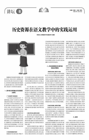 华东理工大学附属闵行科技高级中学 王丽娜 部编版高中语文教材的很多篇目,如革命文学单元、传统文化单元、新闻报道实用类文本单元等,都与历史知识有交叉互融关系,如何利用历史资源丰富语文教学课堂形式,提高语文教学实效,实现学科间的跨界教学,笔者进行了思考研究和实践探索。 一、高中语文教学融合历史资源的必要性 1.“文史相通”的传统理念 “文史相通”是中国传统文化中一个重要的理念,它体现了文学和历史之间的紧密联系和相互渗透。其实在中国古代,文史是不分家的。许多历史学家同时也是文学家,他们的著作往往既是历史记录,又是文学作品。例如,司马迁的《史记》就是一部兼具历史价值和文学价值的著作。在《史记》中,司马迁通过生动的叙述和细腻的描写,将历史事件和人物栩栩如生地呈现在读者面前,让人们不仅能够了解历史事实,还能够感受到历史的情感和韵味。在中国文化中,文学和历史都被视为人类精神文化的重要组成部分,它们不仅能够传递知识和信息,还能够启迪人们的思想和情感。通过文学和历史的相互渗透和融合,人们可以更加深入地了解历史和文化,更加丰富自身的精神内涵。 2.语文教材篇目多有涉及部编版高中语文教材选纳了多篇古今 中外的经典文本名篇,这些文章有的涉及不同历史朝代的政治经济事件,有的则侧重不同历史时期的生活样态和人文风貌,由此,就呈现出不同时期的中外各国历史图景。 如《子路、曾皙、冉有、公西华侍坐》《论语十二章》等文言文篇目呈现了中华传统儒家文化思想;《庖丁解牛》《老子四章》等文言文篇目则反映了中华传统道家思想要义;《芣苢》《雷雨》《装在套子里的人》等篇目名著展现了不同时期人们身处的时代风貌;《屈原列传》《苏武传》《县委书记的榜样——焦裕禄》等文章介绍了古今伟大人物的生平事迹;《中国人民站起来了》《别了,“不列颠尼亚”》等文章描述了古今中外历史上的重大事件。这就为历史资源服务语文教学提供了跨学科的实施基础。 3.语文学科核心素养内在要求 高中语文核心素养包括语言建构与运用、思维发展与提升、审美鉴赏与创造、文化传承与理解四个方面,历史资源作为重要素材和背景,能够为学生提供丰富的知识体系和文化背景,有助于培养他们的语文学科核心素养。 如利用历史资源中的文献、古籍等,使之成为学习古汉语的阅读材料。通过分析历史事件的原因、过程和结果,学生可以锻炼自己的逻辑思维和辩证思维。同时,通过对历史人物的分析和评价,学生可以提升自己的批判性思维和创造性思维;历史资源中的文学作品、艺术作品等,都是审美鉴赏的好材料。通过分析历史文学作品的艺术手法、情感表达等,学生可以提升自己的审美鉴赏能力。同时通过模仿古代文学作品的创作风格和技巧,学生也可以培养自己的审美创造能力;历史资源是文化传承的重要载体,通过学习历史资源,学生可以了解中华文化的起源、发展和演变过程,增强对中华文化的认同感和自豪感。同时,通过对比不同历史时期的文化特点,学生也可以更好地理解文化的多样性和包容性。 二、历史资源服务语文教学的实践运用策略 1.借助历史典故,激发学习兴趣 文言诗文学习过程中,学生常有畏难情绪,加上古代文化背景的陌生感,也使得学生对文言诗文的学习常常停留在背诵识记的层面。这时教师可以借助诗文中出现的历史典故,提高教学的趣味性,激发学生兴趣。如在《永遇乐·京口北固亭怀古》教学过程中,学生对多处典故引用不甚理解,教师就讲述了南朝刘宋皇帝刘义隆幻想像霍去病那样打败游牧民族然后到狼居胥山,从而草率北伐却无功而返。随后北魏皇帝拓跋焘组织反攻,直接打到了长江北岸、南朝都城建康对面的瓜埠山,刘义隆在建康北望,“仓皇北顾”的情景,借助此典故让同学们进一步感受“元嘉草草,封狼居胥,赢得仓皇北顾”这一句中所呈现的、南宋词人辛弃疾既抒发思古之情,又状写现实的感慨。 2.创设历史情境,消弭时代隔阂 部编版高中语文篇目中的许多文学作品,尤其是古代文学作品,与学生所生活的时代存在明显的隔阂,给学生理解和欣赏这些作品带来了一定的困难。为了帮助学生克服这种时代隔阂,教师可以创设历史情境,帮助学生消弭时代隔阂,更好地理解古代文学作品。 如教授曹操名篇《短歌行》时,教师可以通过创设历史情境的方法,将学生带入曹操所处的时代,感受他的心境和情感。教师可以先展示有关三国时期的历史资料、人物介绍等视频,引导学生了解历史背景,包括曹操的生平、政治军事成就以及他在文学上的贡献,进而为理解《短歌行》中的情感表达提供背景知识;课堂上在补充了“曹操当时已拥有荀彧、荀攸等五大谋士为代表的智囊团。建安十三年,曹操‘挟天子以令诸侯’,先后击败吕布、袁术等豪强集团,又在著名的官渡之战一举消灭了强大的袁绍势力,统一了北方”的背景资料以及当时各军阀为了发展自己的势力,都在延揽人才的时代背景后,引导学生用角色扮演的方式,还原曹操对着众多的宾客和将士的华丽宴会场景,在此基础上学生就更好理解曹操“良禽择木而栖,贤臣择主而事”的画外音了。 3.援引历史资料,建构多元认知 部编版高中语文教材收录了多篇关于重要历史事件、著名历史人物的