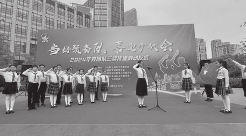 记者 周胜洁 图 吴恺 今年是上海建立少代会制度40周年,全市少先队员将迎来少先队上海市第九次代表大会。4月22日下午,在距离“六一”40天之际,“当好预备队 喜迎少代会”党团队三旗传递活动从黄浦区中共一大纪念馆出发了。 活动由合唱《歌唱祖国》拉开序幕,30名来自上海师范大学附属卢湾实验小学的少先队员歌声嘹亮,向鲜艳的红领巾唱出新时代少先队员自强自信的心声。 紧随着旋律响起,12名少先队员执旗手高擎着党团队三旗入场,他们的动作整齐划一,展现出少先队员的团结与朝气。 仪式现场,时代楷模,全国教育系统先进工作者,上海市黄浦区卢湾一中心小学党支部书记、校长吴蓉瑾看着鲜艳的红领巾衬托少先队员稚嫩的脸庞,看到党旗、团旗、队旗指引下,他们坚定的目光,让她振奋不已,“希望少先队员们谨记习爷爷的话,从小学习做人、从小学习立志、从小学习创造,努力成为有理想、敢担当、能吃苦、肯奋斗的时代新人。” 中国青年五四奖章集体、中国船舶集团第七〇八研究所两栖攻击舰研发设计团队青年代表、军船一部团支部书记郑国威是一名科研工作者,他告诉少先队员,祖国的强大离不开科研的支撑,而科技的进步需要青少年一代共同的努力,“祖国的明天需要我们去创造,民族的未来需要我们去担当,向着梦想勇敢启航。” 全国优秀少先队员、上海市民办立达中学的章紫萱同学带领队员们重温入队誓词。铿锵有力的誓言在广场上回荡,彰显出少先队员们的坚定信念。 “区十佳提案”颁奖仪式环节,黄浦区教育党工委书记陈亮、共青团上海市委少先队工作部部长周勇为获奖代表颁奖,肯定了少先队员在提案活动中的出色表现,鼓励他们为社区发展贡献力量。 中共黄浦区委副书记李忠兴,市少工委主任、市少先队总辅导员赵国强以及中共一大纪念馆党委副书记、纪委书记汤匀共同完成党团队三旗传递启动。 赵国强表示,今年将召开的少代会不仅回顾过去5年,还要回顾少代会制度建立40年来,从第一届到第八届的历程,推出历代少先队辅导员代表。此次少代会的主题是“当好预备队 奏响人生三部曲”,所以将党团队三旗传递活动的启动设在党的诞生地,让少先队员牢记“今天是红领巾,明天要成为共青团员、共产党员”。赵国强也希望新一代少先队员能成为“红孩子”,走进红色场馆,传承红色基因;成为“好孩子”,勤奋学习,热爱科技,勇于创新;成为“棒孩子”,身心健康,活泼开朗,积极向上。 据悉,此次党团队三旗将在少先队员们的手中,途经全市16个区,最终到达市第九次少代会主会场。此次三旗传递活动旨在树立和增强少先队员对团组织、党组织的向往和崇敬,奏响追求政治进步的“人生三部曲”,在他们的心田里播撒“入队——入团——入党”的政治理想的种子。