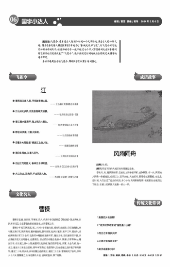 编者按:飞花令,原本是古人行酒令时的一个文字游戏,源自古人的诗词之趣,得名于唐代诗人韩翃《寒食》中的名句“春城无处不飞花”。行飞花令时可选用诗词曲中的句子,但选择的句子一般不超过七个字。《中国诗词大会》等诗词综艺栏目也引进并改良了“飞花令”,选手在规定时间内说出含有规定关键字的诗句即可。 本栏目每周会推出飞花令,帮助同学们积累古诗词佳句。 ● 寒雨连江夜入吴,平明送客楚山孤。 —— 王昌龄《芙蓉楼送辛渐》 ● 江山如此多娇,引无数英雄竞折腰。 —— 毛泽东《沁园春·雪》 ● 春江潮水连海平,海上明月共潮生。 —— 张若虚《春江花月夜》 ● 野径云俱黑,江船火独明。 —— 杜甫《春夜喜雨》 ● 日暮乡关何处是?烟波江上使人愁。 —— 崔颢《黄鹤楼》 ● 海日生残夜,江春入旧年。 —— 王湾《次北固山下》 ● 日出江花红胜火,春来江水绿如蓝。 —— 白居易《忆江南·江南好》 ● 大江东去,浪淘尽,千古风流人物。 —— 苏轼《念奴娇·赤壁怀古》