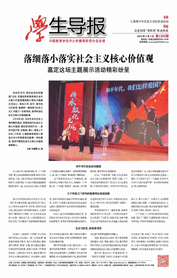 在和平年代,我们应该如何爱国?近日,在嘉定区教育系统社会主义核心价值观落细落小落实主题展示活动上,来自小学、初中、高中的三位老师,围绕同一部电影《长空之王》,开展了一次跨学段、跨学科的社会主义核心价值观教育。 2014年5月,习近平总书记在上海考察时指出,培育和践行社会主义核心价值观,贵在坚持知行合一、坚持行胜于言,在落细、落小、落实上下功夫。十年来,上海教育系统深入推进大中小学思想政治教育一体化建设,坚持不懈用社会主义核心价值观铸魂育人。 记者 刘春霞/文、图 和平年代应该如何爱国 在上海大学上海电影学院,有一门“光影中国”课,它由5位教授联合授课,很受大学生的欢迎。于是,上海大学把这个做法的经验辐射到了小初高学段,与上海大学嘉定基础教育集团的老师一起,立足社会主义核心价值观三个层面的关键词,构建了一套贯穿教育集团小、初、高三个学段的“影领成长”课程体系。 这个课程体系由10个专题构成,鼓励老师以问题引导的方式,围绕同一个专题、同一个问题,观看同一部电影,来开展跨学段、跨学科的价值观教育。 比如,“中国英雄”专题,对应的是社会主义核心价值观中的“爱国”主题。三个学段的老师都选择了《长空之王》这部电影,引导同学们探究:“在和平年代我们应该如何爱国?”在上海大学附属嘉定留云中学八年级同学上树立总体国家安全观这一课时,不少同学产生了一个疑惑:在和平年代为什么我们还要不惜一切去维护国家安全、捍卫国家利益? 三个学段三门学科的教师同台现场说课 留云中学思政老师以《长空之王》这一影片作为教学资源,通过项目化学习的方式,引导学生在做中学、学中悟。同学们分成小组,通过电影小报的制作和展示,让更多同学了解那些为了国家、为了人民的安全而奋斗在第一线的试飞员。小报的版面设计图文并茂,不仅概括了电影概要和观影感受,还很巧妙地把《道法》学科知识融合进来。在将个人理想与祖国命运结合起来的过程中,爱国的种子也在同学们的思辨展示中成长起来。 而在上海大学附属嘉定高级中学,老师则让学生结合《长空之王》中的人物形象和故事情节,思考其中展现的精神品质和人生选择对自己有什么启示,并联系自己的生活,以“和平年代,我们怎样爱国”为题写一篇演讲稿。 苏张扬同学写了一篇演讲稿,却被其他同学评价为“有点空”。又仔细对电影中的人物进行了分析后,他意识到,电影中最打动人的不是那些台词,而是融入骨血的家国大义。影片记录了一位航天人从幼稚到成熟的过程,更像一个国家的航空技术,从成熟到强大的过程。他对演讲稿进行修改后,获得了老师、同学的一致认可。 三个学段三门学科的教师同台现场说课,展示了“爱国”主题落细落小落实在不同学段、不同学科课堂中的实践做法。 生生习技艺、校校有项目 活动中,上海高校“大师剧”中小学校园行项目也正式启动,一批“大思政课”兼职教师被授予聘书。短片《多彩嘉定 精彩课外》聚焦“富强”主题,展示嘉定区整合区域优质科创资源,构建大思政工作格局的成效。上海师范大学学生、嘉定区震川中学学生以舞台剧的形式,生动演绎上海师范大学老校长廖世承、震川书院先贤震川先生的生平事迹,再现大师躬耕教育、泽被后世的精神风貌。 震川中学还精心打造“蓝印生活——非遗文化药斑布课程”,为学生打开了一扇通往传统文化宝库的窗户。在课程中,学生亲手种植草药,设计和创造药斑布产品,感受非物质文化遗产的深厚底蕴和无穷魅力。 现场,嘉定区还以读本、唱片等成果辑录和篆刻、书法、草编、剪纸、竹刻、陶艺等多种艺术形式,以及学生现场社团活动,多途径多载体呈现社会主义核心价值观育人成效。 据介绍,嘉定区以“非遗进校园”与“校园艺术联盟”为抓手,实施青少年民族文化培训工程,形成了“生生习技艺、校校有项目、区域呈特色”的格局。外冈小学的茶艺、同济黄渡小学的剪纸、南翔小学的民乐、方泰小学的篆刻等都形成了系列校本课程群,为学生提供丰富的文化营养。