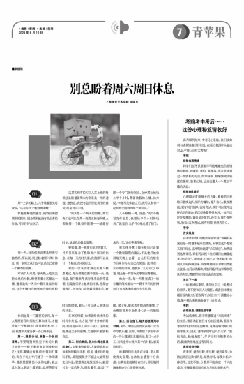 上海视觉艺术学院 宋晓东 01 周一上学的路上,儿子皱着眉头对我说:“还有好久才能到周末啊!” 我能理解他的感受。他特别渴望周末的到来。因为周末就没有那么多的作业,可以好好去玩了。 这其实和有的打工人在上班的时候总是盼望着周末的到来是一样的道理。想到这,我没有急于否定孩子的感受,而是对儿子说: “周末是一个两天的假期,其实我们也可以在周一到周五的每天晚上都安排一个微型的假期——就是安排一个专门的时间段,全神贯注地玩上半个小时,带着放假的心情。比方说,今晚写完作业之后,我可以和你一起玩昨天刚到的那个新玩具。” 儿子眼睛一亮,说道:“对!今晚写完作业后,我要玩半个小时的玩具。”说完后,儿子开心地走进了校门。 02 每一天,对我们来说都是珍贵与独特的。所以说,别总盼着周六周日休息,周一到周五我们也可以给自己安排一个微型的假期。 对我个人来说,每天晚上吃完去扔垃圾的时候,顺便围着小区溜达一圈,通常是我一天当中最为放松的时刻。这个大概15分钟到20分钟的放松时刻,就是我的微型假期。 要知道,周一到周五存在的意义,并不仅仅是为了换取周六周日的休息。在每一天的时光里,我们都可以设计一个精致的休闲时光。 我的一位来访者最近在复习雅思考试,每天都要在图书馆坐一天。他说道,复习雅思考试对他来说非常重要。但是每天早上起床的时候,他都会很挣扎,因为内心会想着非常辛苦、疲惫的一天,正在等着他呢。 我和他分享了每天给自己设置一个微型假期的建议,于是他开始尝试每天晚上去看一会儿好玩的综艺节目来作为对自己的奖励。这样在一天开始的时候,他就多了几分动力。毕竟,晚上有一件好玩的事情在等着他。 如此一来,每一天都变成了一场有趣的闯关游戏——既有学习的拼搏努力,也有休闲时刻的小小奖励。 03 休闲也是一门重要的学问,每个人都需要花时间去打算和学习,才能让每一天都拥有心灵休憩的机会。下面,我想和大家分享一点心得体会。 第一,提前计划,准备一个休闲清单。不要等到突然空下来的时候才去想——接下来我该如何放松自己?这件事情应该提前计划和打算的。我在手机上专门建了一个休闲清单,遇到想要看的小说和电影,就会及时加入到这个清单里。这样等到有时间的时候,就马上可以进入到休闲的状态。 在家的时候,如果留给我休闲的时间非常短,比方说只有十分钟的时间,我会选择和儿子玩一会儿。这样既能增进父子间感情,又能很好地放松自己。 第二,别怕麻烦,努力休闲才能放松身心。如果害怕麻烦,人就很容易在休闲的时候玩手机。但是,漫无目的地玩手机、刷短视频并不能让大脑得到充分休息。要想真正地放松身心,就要付出一定的努力,例如看书、运动、下棋、爬山等,做这些有挑战的事情,才会更加容易体会到身心合一的愉悦感。 第三,活在当下,每天都值得用心对待。另外,我们还要尝试在每一天当中寻找乐趣。比如,我参加了学生举办的一个心理减压主题活动,做了一点手工,当我全身心投入其中的时候,感觉特别好。 如果我们总是活在未来,那么即使身处假期,也依然会感到十分焦虑。如果我们能够活在当下,那么随时随地都会让心灵得到休憩。
