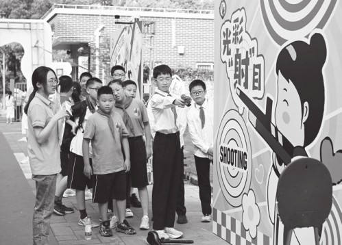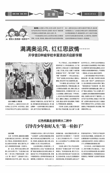 编者按:立德树人少年时,扣好人生第一粒扣子!习近平总书记多次用“要扣好人生的第一粒扣子”来喻指青少年要树立正确的价值观,迈好人生第一步。 “不仅教授学生以知识,更引导他们树立正确的世界观、人生观、价值观,实现知识学习与品行修养的有机统一,培养在社会主义现代化建设中可堪大用、能担重任的栋梁之才。”上海通过加强未成年人思想道德建设和文明校园创建工作,提高协同育人水平,为孩子们创造更加利于全面发展的社会环境。从本期开始,本报将对这些优秀案例和征文作品进行一系列报道。 记者 刘春霞/文 吴恺/图 9月2日早上,上海约225万名中小学生和幼儿正式开学。与往年相比,虽然今年的开学日天气比较热,但各学校还是准备了丰富的活动。走红毯“跨栏”进校、听劳模科普《神奇的激光》、学习奥运精神……在各种有趣又有仪式感的活动中,孩子们开启了新学期的生活。 早上不到8点,上海大学附属中学实验学校门口,学生陆续抵达。为了迎接同学们,学校在校门口至教学楼的路上铺上了红毯,红毯上放置了12道写着祝福语的“栏杆”:“勇于拼搏”“坚持不懈”“求知明理”……学生走在红毯上“跨栏”进校园,然后在奥运主题的心愿墙上签名并写下自己的新学期心愿。 “今年暑假,我们共同见证了巴黎奥运会的辉煌时刻。中国的奥运健儿身上所展现出的爱国、自信、勇敢、团结,如同璀璨的星辰,引领着我们每个人在人生的赛道上都勇往直前。”开学典礼上,校长许杰以同学们喜欢的运动员郑钦文、潘展乐、樊振东、全红婵和陈芋汐为例,鼓励大家学习奥运精神,不懈努力,不断挑战自我、超越自我。 打排球、玩射击,在嘉定区新城实验中学以“新城闪耀,引以为奥”为主题的开学仪式上,同学们在各种趣味运动中追逐自己的金牌梦想。学校方面表示,希望同学们能传承奥运精神,在生活中展现出卓越的精神和能力,不畏惧每一项挑战,全力以赴,做自己的冠军。 上海市青浦高级中学的开学典礼暨思政第一课主题为“新学期 新征程 扣好人生第一粒扣子”, 由学校党总支书记、 校长蒋伟勇为全体师生带来了题为“青春就是奋斗”的思政第一课。蒋校长希望同学们能够像奥运健儿那样, 追求“得其大者兼其小”的人生境界, 将个人的圆梦之路与国家的荣誉和形象紧密相连。 他提到, 青中坚守“磨炼育人, 玉汝于成”的办学理念, 即通过三年的“磨炼”, 在困难与挑战中成长成才。 他勉励同学们要热衷于学习, 以开放的心态接纳新知, 不断拓宽视野、 深化理解, 不断探索世界和人生。