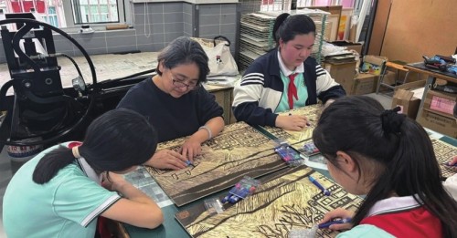 最近几天,上海市第十中学大礼堂陈列的一幅木刻版画长卷吸引了很多学生的目光,这是学校黑白木刻版画小组的17位同学在美术教师强静的带领下历时半年完成的。记者了解到,市十中学是上海市“非遗进校园”优秀传习基地,长期开展黑白木刻版画课程,此次是同学们在老师的引导下开展项目化学习,通过协作与探究,努力尝试将文学作品的内涵以视觉艺术的形式展现出来。 记者 刘春霞 将红色谍战小说刻成长卷 今年是新中国成立75周年,市十中学《红色融创》校本课程,以阅读获得第十一届茅盾文学奖的长篇小说《千里江山图》为起点,开展了由“看江山”“走江山”“赞江山”等版块组成的系列活动,呈现了别具一格的红色思政教育。 结合《红色融创》课程中的“看江山”版块,学校黑白木刻版画小组的17位同学想根据小说《千里江山图》创作一幅木刻版画长卷。为此,上海虹桥半岛版画艺术中心的版画家邹向群和顾萍萍老师亲临学校,给予学生现场指导。 《千里江山图》以设于上海的党中央机关1933年的战略大转移为背景,讲述地下党员陈千里临危受命,带领临时行动小组,完成中共中央布置的“千里江山图”绝密任务的故事。根据创作内容,同学们讨论生成了四个项目小组:虹口区组、老西门组、南京路组和外滩组。从今年4月至9月,经过选题入项、搜集素材、绘制草图、木刻制版、拓印作品、长卷装裱等项目阶段,历时半年时间,师生们终于完成了长卷的创作,并将作品陈列在学校大礼堂。 极致考验耐心与精细度 小说将革命、谍战、理想等元素巧妙融合,既是一部革命史,也是一本风物志。通过叙事回溯时代风貌,街巷、饮食、视觉和味觉唤起人们对上海的记忆。“在搜集素材时,我了解到老上海的风土人情,让我对祖辈的生活有了更深的认识。”桑宇萱同学介绍说,刀刻制版过程中,在老师的耐心指导下她学习到了许多刀法和技巧,“制作版画的过程,需要脑、眼、手协作,能够刺激大脑活跃度,锻炼四肢的协调性,尤其是手的灵活度,让我收获满满。” 在《千里江山图》长卷创作过程中,让何梦雨同学印象最深的是“刀刻制版”阶段,“这是一场对耐心与精细度的极致考验,每一刀下去,都需谨慎而有力,既要准确表达不同的笔触,又要考虑木板材质的特性,确保线条流畅且深度适中。”何梦雨说,整个学习过程让自己深刻体会到,艺术创作不仅是视觉的享受,更是心灵的磨砺,“它教会我如何在细节中寻找完美,让作品更加生动传神。同时,在完成长卷的过程中,也让我体会到与同学们共同学习、协作的快乐。” 协作精神让作品更完美 吴晨妍同学和小伙伴们挑选了小说《千里江山图》中最打动人的场景,以此为核心进行版画创作。在她看来,如果说每位同学分别绘制的“千里江山图”单品是一幅精美细致的版画小卷,生动诠释老上海单个著名建筑的神韵,那么所有同学共同绘制并拼接完成的“千里江山图”则是一幅波澜壮阔的版画长卷,“在老师的指导下,我们共同查找历史资料,明确题材分工,统一创作风格。正是这样的团结协作精神让我们的作品细节更加完美,更富魅力,呈现出的整体性更令人心潮澎湃。” 学校方面表示,这次项目化学习实践研究十分有意义,同学们阅读《千里江山图》并进行木刻版画创作,提高了历史感知能力。教师引导学生像艺术家一样思考、协作与探究,提升了学生的美术学科核心素养,传承了“非遗”文化。同时,本次项目化学习还为学校文学与艺术教育的融合提供了新的视角和方法。