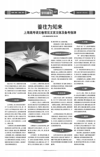 上师大康城实验学校 程立海 通过对近十年上海高考语文试卷中文言文考查内容的比对、梳理、归纳与分析,不难发现以下方面将依然是2025年上海高考语文文言文命题与考查的重点与关键,应引起广大备考师生的高度关注。 一、杂记类 众所周知,杂记类包括的范围十分广泛,除传状(即传记行状,是一种记述个人生平事迹的文章。传状文一般用于记述那些在历史上较有影响而事迹突出的已死的人物生平事迹,多采取叙述、描写等手法,展示人物的生平风貌)、碑志外,凡是记事记物的文章均可归入此类。大体分台阁名胜记、山水游记、人事杂记等。 1.台阁名胜记是为修建亭台楼阁或是游览名胜古迹而写的文章。以介绍事情本末、建造者、建造过程、周围景物等为主要内容,作者可借题发挥,抒发个人思想感情、抱负、志趣和意愿。例如范仲淹的《岳阳楼记》、欧阳修的《醉翁亭记》,都是台阁名胜记的名篇。2023年上海高考语文卷文言文阅读(二)就选取了《游京师郭南废园记》。 2.山水游记,主要是写登山临水的见闻观感,以描写自然景物为主。例如有写竹、写水、写石、写鱼的柳宗元的《小石潭记》;有写雪、写堤、写亭、写舟,风景如画、真切感人的张岱的《湖心亭看雪》;有写景,兼发议论和说理的王安石的《游褒禅山记》;有表现作者非凡才识和高超思致的苏轼的《石钟山记》。 3.人事杂记,是以记人叙事为内容的文章,例如写史可法抗清事迹的全祖望的《梅花岭记》,写家常小事的归有光的《项脊轩志》,借写病梅以讽刺社会现实的龚自珍的《病梅馆记》等。2024年上海高考文言文阅读(二)所选元代李祁的《诚意斋记》即属此类。 二、书牍类 主要是指个人之间交往的书信。这种体裁也有不少异名,例如书、上书、启、尺牍、简、帖、简帖、礼、简札、书札、牒、笺、移等都属于此类。 古代和现代一样,常用这种体裁,而且非常重视,把它作为交流思想、通报情况、发表主张的媒介和载体。许多书信写得词情意切、感人肺腑、催人泪下、可歌可泣,是文质兼美、脍炙人口、常读常新、富含哲理、给人启迪的名篇。 具有典型性、代表性、精品性的力作有:林觉民的《与妻书》、李斯的《谏逐客书》、王安石的《答司马谏议书》等。 三、公牍类(奏/议/疏/表/对策) 该类文是古代臣属进呈帝王的奏章的统称。它包括奏、议、疏、表、对策。通常是分条陈述臣子的某种意见或事情,或者是作者针对某些具体问题而提出的解决策略和方法。 向皇帝进言的文书,是希望皇帝能够纳谏,为此,必须要在文辞上宛转而令皇帝悦纳。因而进言的观点必须鲜明,切中时政,才能让皇帝愿意接纳其谏言,也只有这样,才能凸显纳谏的价值、作用和意义。 最为耳熟能详、有口皆碑、影响巨大的有贾谊的《论积贮疏》、李密的《陈情表》、苏轼的《教战守策》等。 四、说/论/辩 这是古代议论、说明一类文章的总称。它与“论”没有多大差异。所以后来统称说理辨析文为论说文。辩驳说理一般要追本溯源,主要有寻根究底式反驳,抓类比逻辑错误去辩驳,演绎推理辩驳,举实例进行类比辩驳等方式、方法。 众所周知的经典之作有:柳宗元的《捕蛇者说》、韩愈的《师说》、苏洵的《六国论》、贾谊的《过秦论》等。2016年、2018年上海高考文言文所选明代朱舜水的《勿斋记》、明代李贤的《心源亭记》就是典型代表。 五、赋 此种文体讲求文采、韵律,兼具诗歌和散文的性质。其特点是“体物写志”。它侧重于写景,融情于景,借景抒情。如选入课本的《阿房宫赋》《前赤壁赋》《后赤壁赋》等。 六、序/跋 序也作“叙”“引”,是说明书籍著述或出版意旨,编次体例和作者情况,以及本文主要内容的文章。也可包括对作家作品的评论和对有关问题的研究阐发。 “序”一般写在书籍或文章前面(也有写在后面的),写于书后的称为“跋”或“后序”。其中包含对作者作品进行评论或对问题进行阐发解说,属于议论文。如文天祥的《指南录后序》、欧阳修的《伶官传序》等。 另一种是用来评价著作的,称之为书序。多见于著作或诗文前的说明性文字,即诗文序。如姜夔的《扬州慢》前的小序、白居易的《琵琶行》前序等。 还有宴集序,即古人宴集时,常同时赋诗,诗成后公推一人作的序。如王羲之的《兰亭集序》等。 七、赠序 在古代,朋友、同僚、亲人等送别时,会各以诗文相赠对方,以表达离情别意与依依不舍的深情。集而为之作序的,称为赠序。内容多推崇、赞许或勉励之辞。如宋代欧阳修的《五代史伶官传序》、明代宋濂的《送东阳马生序》、魏晋王羲之的《兰亭集序》、唐代王勃的《滕王阁序》,以及《扬州慢》(诗歌前有小序)《愚溪诗序》《指南录序》《指南录后序》等。 八、箴铭类 古代刻在器物上用来警戒自己或称述功德的文字叫“铭”。刻在牌上,放在书案右边用以自警的铭文叫“座右铭”。家喻户晓的有唐代刘禹锡的《陋室铭》、宋代寇准的《六悔铭》等。 刻在石碑上,叙述死者生平,加以颂扬追思的,叫“墓志铭”。如唐代韩愈的《柳子厚墓志铭》、清代袁枚的《祭妹文》等。 希望以上对各类文体的梳理、归类、解说和备考等内容,能让2025届的高考师生有所借鉴。