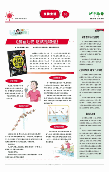◆ 作者:爆糖童书 编绘 ◆ 出版方:人民邮电出版社 童趣出版有限公司 内容简介:本书是为7岁以上孩子打造的物理入门级漫画图书。书中以初中物理知识为框架,通过大量通俗易懂的语言和生动形象的漫画形式将晦涩难懂的物理知识轻松、有趣地呈现给适龄孩子。生活是孩子最好的老师,2022年教育部新课标倡导孩子通过身边的事物去认知、去思考,本书通过大量生活现象引导孩子发现身边有趣的物理现象,并通过揭秘这些现象,让孩子养成以理科的视角和思维去问、去想的好习惯。 宁折不弯! 当光线从空气射入水或玻璃中,还会呈一条直线吗?在同一种密度均匀的介质中,它能保持直线传播,但当进入另一种完全不同的介质时,光会“宁折不弯”。 速度有了改变 法国人皮埃尔·德·费马认为,当光进入陌生的环境,需要一条“平稳”的路线来继续传播,而进入不同的介质,它的速度也会不一样。当光穿过空气时,传播速度比较快,当它穿过水里,传播速度会变得稍慢一些,这个改变导致了折射的发生。 折射的特点: 光从空气斜射入水或其他介质中时,折射角小于入射角;入射角增大时,折射角也随着增大。 与反射的相同点: 折射的光路也是可逆的。折射只发生在斜射的情况下,如果光线垂直射入,就不会发生偏折。 好像折断了 把一根吸管放进盛水的杯子里,吸管在空气和水的交界处好像折成了两截。真的折断了吗?当然不是。从空气射入水中,由于传播速度和方向都发生了改变,光线也随之出现偏折。不信你再把吸管拿出来,保证它还是笔直的。 被折射的光线与法线所构成的角,叫折射角。折射角的大小受光线在介质中传播速度的影响。在两种介质中的传播速度差异越大,光线偏折就越严重。 被欺骗的眼睛 由于光的折射,我们的眼睛会受到“欺骗”。比如,当我们看向水里的鱼,眼睛看到的位置并不是鱼在水里的实际位置,会出现一点儿小小的错位,这个错位就是由光的折射而造成的。