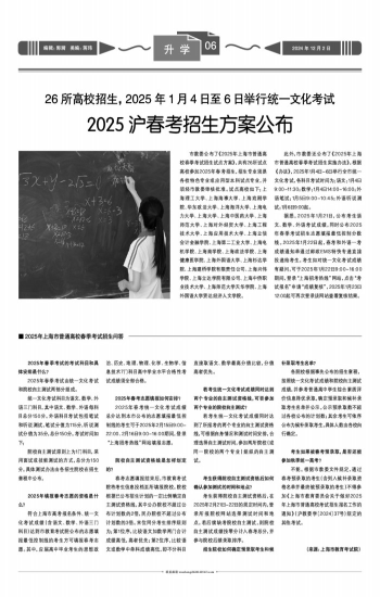 市教委公布了《2025年上海市普通高校春季考试招生试点方案》,共有26所试点高校参加2025年春考招生,招生专业须是各校特色专业或应用型本科试点专业,并须经市教委审核批准。试点高校如下:上海理工大学、上海海事大学、上海戏剧学院、华东政法大学、上海海洋大学、上海电力大学、上海大学、上海中医药大学、上海师范大学、上海对外经贸大学、上海工程技术大学、上海应用技术大学、上海立信会计金融学院、上海第二工业大学、上海电机学院、上海商学院、上海政法学院、上海健康医学院、上海外国语大学、上海杉达学院、上海建桥学院有限责任公司、上海兴伟学院、上海立达学院有限公司、上海中侨职业技术大学、上海师范大学天华学院、上海外国语大学贤达经济人文学院。 此外,市教委还公布了《2025年上海市普通高校春季考试招生实施办法》,根据《办法》,2025年1月4日-6日举行全市统一文化考试,各科目考试时间为:语文:1月4日9:00-11:30;数学:1月4日14:00-16:00;外语笔试:1月5日9:00-10:45;外语听说测试:1月6日9:00起。 据悉,2025年1月21日,公布考生语文、数学、外语考试成绩,同时公布2025年春季考试招生志愿填报最低控制分数线。2025年1月22日起,春考和外语一考成绩通知单通过邮政EMS特快专递直接投递给考生。考生如对统一文化考试成绩有疑问,可于2025年1月22日9:00-16:00期间,登录“上海招考热线”网站,点击“考试报名”申请“成绩复核”,2025年1月23日12:00起可再次登录该网站查看复核结果。 ■ 2025年上海市普通高校春季考试招生问答 2025年春季考试的考试科目和具体安排是什么? 2025年春季考试由统一文化考试和院校自主测试两部分组成。 统一文化考试科目为语文、数学、外语三门科目,其中语文、数学、外语每科目总分150分。外语科目考试包括笔试和听说测试,笔试分值为115分,听说测试分值为35分,总分150分。考试时间如下: 院校自主测试原则上为1门科目,采用面试或技能测试的方式,总分为150分。具体测试办法由各招生院校在招生章程中公布。 2025年填报春考志愿的资格是什么? 符合上海市高考报名条件、统一文化考试成绩(含语文、数学、外语三门科目)达到市教育考试院公布的志愿填报最低控制线的考生方可填报春考志愿。其中,应届高中毕业考生的思想政治、历史、地理、物理、化学、生物学、信息技术7门科目高中学业水平合格性考试成绩须全部合格。 2025年春考志愿填报如何安排? 2025年春考统一文化考试成绩总分达到本市公布的志愿填报最低控制线的考生可于2025年2月15日9:00-22:00、2月16日9:00-16:00期间,登录“上海招考热线”网站填报志愿。 院校自主测试资格线是怎样划定的? 春考志愿填报结束后,市教育考试院将考生信息投档至所填报院校。院校根据已公布招生计划的一定比例确定自主测试资格线,其中公办院校不超过公布计划数的2倍,民办院校不超过公布计划数的3倍。末位同分考生排序规则为:第1位序,比较语文加数学两门合计成绩高低,高者优先;第2位序,比较语文或数学中单科成绩高低,即不分科目直接取语文、数学最高分值比较,分值高者优先。 若考生统一文化考试成绩同时达到两个专业的自主测试资格线,可否参加两个专业的院校自主测试? 若考生统一文化考试成绩同时达到了所报考的两个专业的自主测试资格线,可根据自身情况和测试时间安排,合理选择自主测试时间,参加两所院校(或同一院校的两个专业)组织的自主测试。 考生获得院校自主测试资格后如何确认参加测试的时间和地点? 考生获得院校自主测试资格后,在2025年2月21日-22日的规定时间内,登录所报院校网站选择测试时间和地点。若后续缺考院校自主测试,则院校自主测试成绩按零分计入春考总分,并参与院校后续录取排序。 招生院校如何确定预录取考生和候补录取考生名单? 各院校根据事先公布的招生章程,按照统一文化考试成绩和院校自主测试成绩,并参考普通高中学生综合素质评价信息择优录取,确定预录取和候补录取考生名单并公示。公示预录取数不超过各校公布的计划数;其余考生可依序公布为候补录取考生,具体人数由各校自行确定。 考生如果被春考预录取,是否还能参加秋季统一高考? 不能。根据市教委文件规定,通过春考预录取的考生(含列入候补录取资格名单并最终被预录取的考生)不得参加《上海市教育委员会关于做好2025年上海市普通高校考试招生报名工作的通知》(沪教委学〔2024〕37号)规定的其他考试。 (来源:上海市教育考试院)