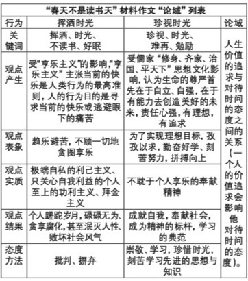上海市向明中学 肖友清 多观点、多概念材料作文的写作,其“论域”的确定至关重要,这是提升此类作文品质的关键。 一、论域与写作 何为“论域”?论域,即论题的外延,是指在一定的语言片段或对话中所涉及的客观事物,即论题所包括的所有核心概念的总和。论域往往用于多观点所牵涉到的多概念的关系类材料作文,写作时要对论题的外延进行界定,在确定其“论域”之后,再思考哪些内容该肯定、哪些内容该否定,哪些还需要补充。 论域如何确定呢?例如,背心与短裤,其论域就是“衣服”;背心、短裤和手链,其论域就是“服饰”。如果把前者的论域界定为“服饰”,在逻辑上就犯了定义过宽的错误;而把后者界定为“服装”,就没有把“手链”囊括进去,犯了定义过窄的错误。在写作过程中,考题所隐含的论域与考生答题的论域应该属于概念之间的全同关系,否则,可能出现类似“以偏概全”或“跑偏”的逻辑错误。 这些类似“以偏概全”或“跑偏”的逻辑错误,虽然属于阅读能力的问题,但在材料作文的写作中往往会带来审题的偏差,导致失分。而这类失误的作文,修改起来要大费周章,另起炉灶,其本质是认知导致的思维偏差。不少人认为,材料作文的写作,只要涉及材料中的某个点即可,可以不及其余,甚至有人认为,可以无视材料,自由发挥。从逻辑严密的角度出发,这些都是答题时的思维漏洞,应该引起大家的注意。高质量的思维,首先体现在构思的预设上,有了严密的预设,才能减少实践中可能出现的错误。高品质的思维训练,不仅关乎写作,更关乎学生未来的发展,是语文学科四大核心素养之一。 二、论域与写作的真题阐述 下面就“论域”在多观点、多概念材料作文中的写作,进行具体阐释。如: 挥洒时光者常说:“春天不是读书天,夏日炎炎正好眠。待到秋来冬又至,不如收拾到明年。” 珍视时光者常说:“盛年不重来,一日难再晨。及时当勉励,岁月不待人。” 在你看来,时间对人意味着什么? 请以《时间的意义》为题,自选角度,写一篇800字左右的议论文。 上述材料中对举了两个对立的观点,前一则叙述的是尽情玩乐享受、不愿刻苦读书的“挥洒时光者”的思想,后一则是叙述分秒必争、努力认真的“珍视时光者”的心理写照,两者对待“时间”的态度截然不同。前者为了享受一年四季的不同时光,抓紧时间尽情玩乐,让生命在春花秋月的繁盛中逸乐蹉跎;后者为了在有生之年创造生命的价值,珍惜时光,努力作为,想用有限的生命创造永恒的价值。这两句话隐藏着两种不同的人生价值观,构成了写作的情境,关涉到的关键词有两组:一组是“挥洒、时光、不读书、好眠”,另一组是“珍视、时光、难再、勉励”。把“时光”合二为一,牵涉到七个关键词。 在这种给定的“情境”下,学生要“以《时间的意义》为题”,与试题展开对话,关键词就多增加一个“意义”,合起来有八个关键词。而标题中的关键词“意义”,又与材料中对举的两种人生价值观的“价值”暗合。该试题暗含了两个问题:一是在无尽的岁月中,人应该如何度过有限的生命:是挥洒时光,尽情逸乐,还是珍惜时光,及时勉励?二是如何赋予短暂生命以意义:是读书,还是及时勉励? 根据上面的审题分析,再来界定该试题的“论域”。该试题“论域”必须涵盖材料中所有的关键词,必须是囊括两个对举观点的语言概括。 下面,我们可以通过表格来梳理该试题的“论域”,图示如下: 根据上表概括出来的“论域”——人生价值的追求与对待时间的态度之间的关系,我们可以得出试题的意图,借评价两种不同的观点,来考查学生在作文中所表达的价值追求。明白这一点之后,我们可以在社会主义核心价值观的指导下,展开或批评、或褒扬、或补充的自我观点的阐述。但必须使用标题《时间的意义》中的关键词进行表述。 明确试题的“论域”,还要厘清“论域”之下概念之间的内在联系。“挥洒时光”和“珍视时光”是两种截然不同的对“生命的价值”取向在行为上的具体表现,引号中引述的语言是支撑两种行为的思想内核。其间“读书”是实现“生命的价值”的手段与途径。 而这几组概念之间,“生命的价值”与“时间的意义”之间的关系,是写作中需要学生调动自己的知识储备进行理性推断的。如果把隐含在材料中的概念“生命的价值”抽象概括出来,再来对接标题“时间的意义”,整个材料理解起来就顺畅了许多。 该题隐含在材料中的一个核心“生命的价值”是连接标题“时间的意义”与材料所述的两种截然不同的言行之间的桥梁。缺了这一中间概念,写起来就总感觉有些逻辑不畅,硬贴标签之嫌。 要做到逻辑通畅,避免硬贴标签。要建构好与“论域”的直接关系,需要同学们用一种高屋建瓴的眼光来审视该题,这样才能写好一篇作文。