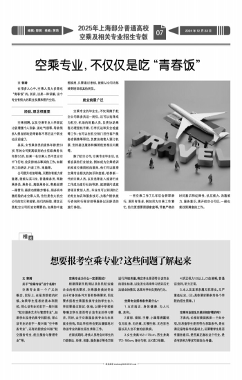 文 郭漪 在很多人心中,空乘人员大多是吃“青春饭”的。其实,这是一种误解,这个专业有很大的职业发展和晋升空间。 经验、理念很重要 空乘招聘,以及空乘专业入学面试比较看重个人形象、谈吐气质等,导致很多人想当然地觉得青春不再后这个职业也没前途了。 其实,女性乘务员的退休年龄是50岁,有的公司更高级别的主任级乘务长年龄55岁。如果一名空乘人员不适应空中飞行时,会安排她从事其他工作,如新员工的培训、行政工作、地勤等。 公司晋升机制明确,只要你有能力有意愿,就能从实习生、普通乘务员、两舱乘务员、乘务长、高级乘务长、客舱经理一路晋升,薪资也能稳步增长。很多有丰富经验的老空乘人员,往往是各大航空公司的宝贝和前辈。他们的经验、理念正是航空公司所迫切需要的。如果你中途想换岗,只要通过考核,就能从公司内部转到培训或其他岗位。 就业前景广泛 空乘专业的毕业生,不仅局限于航空公司乘务员这一岗位,还可以选择成为航空、机场的地勤人员,负责协助乘客办理登机手续、行李托运和安全检查等工作;也可以在航空部门担任客户服务或销售等职位,负责协助客人预订机票、安排接送服务和解答航班相关问题等。 除了航空公司,空乘专业毕业后,也能在其他行业就业,例如成为空乘培训机构或空乘院校的教师。他们可以教授空乘专业相关的知识和技能,培养新一代的空乘人员。以及选择进入旅游行业工作成为旅行社的导游、旅游顾问或旅游项目策划人员。毕业生可以利用自己的专业知识和服务技巧,为客户提供旅行咨询和行程安排等服务以及舒适的旅行体验。 一些空乘工作了几年后会辞职转行,原因有很多,例如因为空乘工作繁忙,他们更想要照顾家庭等,凭着严格的时间意识和纪律性、抗压能力、沟通能力、服务意识,离开航空公司后,一般也能找到满意的工作。