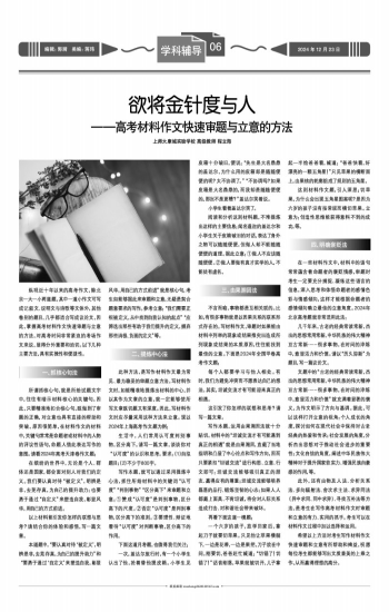 上师大康城实验学校 高级教师 程立海 纵观近十年以来的高考作文,除北京一大一小两道题,其中一道小作文可写成记叙文、说明文与诗歌等文体外,其他卷别的题目,几乎都适合写成议论文,因此,掌握高考材料作文快速审题与立意的方法,对高考时间非常紧迫的考场作文来说,显得分外重要和迫切。以下几种主要方法,具有实操性和便捷性。 一、抓核心句法 所谓抓核心句,就是所给试题文字中,往往有暗示材料核心的关键句。因此,只要精准地扣合核心句,既做到了审题的正确,对立意也具有直接的帮助和突破。原因很简单,在材料作文的材料中,关键句常常是命题者或材料中的人物的评议性语句,命题人借此表达写作的意图。请看2024年高考天津卷作文题: 在缤纷的世界中,无论是个人、群体还是国家,都会面对别人对我们的定义。我们要认真对待“被定义”,明辨是非,去芜存真,为自己的提升助力;也要勇于通过“自定义”来塑造自我,彰显风华,用自己的方式前进。 以上材料能引发你怎样的联想与思考?请结合你的体验和感悟,写一篇文章。 本道题中,“要认真对待‘被定义’,明辨是非,去芜存真,为自己的提升助力”和“要勇于通过‘自定义’来塑造自我,彰显风华,用自己的方式前进”就是核心句,考生如能够据此来审题和立意,无疑是契合题意要求的写作。参考立意:“我们需要正视被定义,从中找到自我认知的起点”“应筛选出那些有助于我们提升的定义,摒弃那些消极、负面的定义”等。 二、提炼中心法 此种方法,是写作材料作文最为常见、最为稳妥的审题立意方法。写材料作文时,如能精准地提炼出材料的中心,并以其作为文章的立意,就一定能够使所写文章既切题又有深度。因此,写材料作文时应尽量采用这种方法来立意。现以2024年上海高考作文题为例: 生活中,人们常用认可度判别事物,区分高下。请写一篇文章,谈谈你对“认可度”的认识和思考。要求:(1)自拟题目;(2)不少于800字。 写作本题,就可以通过采用提炼中心法,抓住所给材料中的关键词“认可度”“判别事物”“区分高下”来审题和立意:①赞成“认可度”是判别事物,区分高下的尺度。②否定“认可度”是判别事物,区分高下的准则。③要理性、辩证地看待“认可度”对判断事物,区分高下的作用。 下面这道月考题,也值得我们关注:一次,盖达尔旅行时,有一个小学生认出了他,抢着替他提皮箱。小学生见皮箱十分破旧,便说:“先生是大名鼎鼎的盖达尔,为什么用的皮箱却是随随便便的呢?太不协调了。”“不协调吗?如果皮箱是大名鼎鼎的,而我却是随随便便的,那岂不是更糟?”盖达尔笑着说。 小学生看着盖达尔笑了。 阅读和分析这则材料题,不难提炼出这样的主要信息:闻名遐迩的盖达尔和小学生关于皮箱破旧的对话,表达了身外之物可以随随便便,但做人却不能随随便便的道理。据此立意:①做人不应该随随便便。②做人要做有真才实学的人,不能徒有虚名。 三、由果溯因法 不言而喻,事物都是互相关联的。比如,有很多事物就是以因果关系的联系形式存在的。写材料作文,审题时如果能由材料中列举的现象或结果推究出造成所列现象或结果的本质原因,往往能找到最佳的立意。下面是2024年全国甲卷高考作文题: 每个人都要学习与他人相处。有时,我们为避免冲突而不愿表达自己的想法。其实,坦诚交流才有可能迎来真正的相遇。 这引发了你怎样的联想和思考?请写一篇文章。 写作本题,运用由果溯因法就十分贴切。材料中的“坦诚交流才有可能遇到真正的相遇”就是由果溯因,直截了当地指明和凸显了中心论点和写作方向,因而只要紧扣“坦诚交流”进行构思、立意、行文即可:坦诚交流能够吸引真正的朋友、赢得应有的尊重;坦诚交流能够培养磊落的品行、锻炼坚韧的心志;如果人人都戴上面具、不肯坦诚,将会对人际关系造成打击、对和谐社会带来破坏。 再看下面这道一模题: 一个六岁的孩子,放学回家后,拿起刀子就要切苹果。只见他让苹果横躺下,一边是花蒂,一边是果把,刀子放在中间。刚要切,爸爸赶忙喊道:“切错了!切错了!”话音刚落,苹果就被切开,儿子拿起一半给爸爸看,喊道:“爸爸快看,好漂亮的一颗五角星!”只见苹果的横断面上,由果核的轮廓组成了规则的五角星。 这则材料作文题,引人深思:切苹果,为什么会出现五角星图案呢?是因为六岁的孩子没有按常规而横切苹果。立意为:创造性思维能获得意料不到的成功,等。 四、明确褒贬法 在一些材料作文中,材料中的语句常常蕴含着命题者的褒贬情感,审题时考生一定要充分捕捉、凝练这些语言的信息,深入思考和体悟命题者的感情色彩与情感倾向,这样才能根据命题者的感情倾向确立最佳的立意角度。2024年北京高考题就非常适用此法: 几千年来,古老的经典常读常新,杰出的思想常用常新,中华民族的伟大精神亘古常新……很多事物,在时间的淬炼中,愈显活力和价值。请以“历久弥新”为题目,写一篇议论文。 文题中的“古老的经典常读常新,杰出的思想常用常新,中华民族的伟大精神亘古常新……很多事物,在时间的淬炼中,愈显活力和价值”就充满着显著的褒义,为作文明示了方向与基调。据此,可以这样打开立意的视角:个人成长的角度,探讨如何在现代社会中保持对古老经典的热爱和传承;社会发展的角度,分析杰出