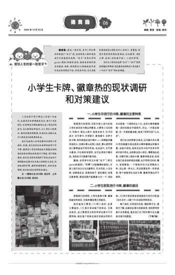 小马宝莉卡等卡牌在小学里广为流行,也被家长和新闻媒体关注。除了小马宝莉卡,还有哪些卡牌和徽章正在小学生中间流行,怎么看待这种流行,大人有大人的观点、媒体有媒体的观察,但我们认为缺乏我们小朋友自己的视角和表达。 我们兄妹两人分别在静安区两所小学读书。近期,我们在家长和老师的指导下对卡牌、徽章在小学生中间的流行现象分别到各自班级和周边班级进行了调查。除了网络搜索,我们还在家长的陪同下实地走访位于新闸路和乌鲁木齐北路上的两家文具店,向老板询问卡牌、徽章的销售情况。结合这些调研,我们给出自己的研究和建议。 文 一师附小五(8)中队 肖云晞 上外静小五(4)中队 肖云晫 一、小学生中流行的卡牌、徽章的主要种类 根据我们的调研,目前市面上流行的供小学生购买的卡牌品种繁多,主要有小马宝莉卡、柯南卡、第五人格卡、初音未来卡、咒术回战卡、宝可梦卡、叶罗丽卡、奥特曼卡、吉伊卡哇卡等。有些班级还流行烟卡——用烟盒折叠而成的卡。但烟卡要么在网上购买,要么是同学自己拿烟盒动手制作而成。在这其中,宝可梦卡最贵,不仅具有观赏性,还可以用来打牌对战。而其他卡只能看不能对战。 徽章,在同学中间又叫做“谷子”(英文goods的谐音)、“吧唧”(日语徽章的谐音),市面上流行的又分为文豪野犬、咒术回战、小马宝莉、动物森友会、我推的孩子、蓝色禁区、间谍过家家等。便宜的国产版徽章10元一个,贵的日本原版一个卖到四五十元。这些卡牌和徽章隔一段时间就会升级换代。所以,一方面追新款,另一方面收藏老款,就成了同学们的“心头好”。 我们走访的两家文具店,以乌鲁木齐北路20号的海健文具店卖的卡牌和徽章品种最丰富。老板介绍说,前来买这些卡的不仅有市西初中的中学生,也有附近的小学生。需要指出的是,尽管市面上卖的卡牌、徽章种类多多,但结合我们在各自学校的观察,由于同学们时间、精力、金钱限制,一个班级往往只玩有限的几种,且以某一种为主。而且即便在同一所学校里,每个班级学生玩的卡牌、徽章种类也并不相同。 二、小学生获取流行卡牌、徽章的途径 根据我们的调研,小学生获得卡牌、徽章的途径有购买、交换和赠送等几种途径。 购买途径主要有:(1)网上购买,这是主要途径。(2)部分来自线下实体店、文具店购买。这主要是因为有些同学在家中不方便网购,就在线下实体店购买或者由同学代购。(3)用手里的现金或校园发行的代币奖励(如礼仪币、小脚丫币)向其他同学购买。 除了购买,还有校内交换、赠送等方式。据我们了解,在喜欢玩烟卡的班级里,有的男同学家中没有烟盒,甚至自己为了制作烟卡会去翻捡垃圾中的烟盒。 三、卡牌、徽章何时在小学生中间流行 根据我们的了解,卡牌、徽章在静安区的两所小学流行起来,是从上学期开始的。这一点,也被我们走访的两家文具店的老板证明。他们说,虽然小马宝莉卡牌之前也有卖,但来买的并不多,从今年上半年才开始火爆。学生来跟他们讲还想要什么品牌的卡牌或徽章,他们就去找渠道采购。 卡牌、徽章在小学生中的流行跟网络游戏的流行不同,同学们不仅在家里玩,还拿到学校里和其他同学玩和炫耀。在学校里,同学们主要在课间休息时玩。有的班级上美术课时完成美术作业后,也有同学拿出卡牌画画等等。当然,也有极个别同学上课时偷偷拿出自己喜欢的卡牌、徽章欣赏。 四、小学生为什么喜欢卡牌、徽章 (一)社交货币。所谓社交货币是指个人通过分享、交流和互动所获得的关注、认同和赞赏等,它能够提升个人形象,增加与他人的联系感和认同感,建立社会归属感。“其实这就是孩子们的社交货币”,文具店老板叔叔的这句话让我们豁然开朗。确实如此。贵的东西未必成为社交货币。如班上有些同学戴名贵的手表或者穿名牌鞋子,但这些不能增强与他人的联系和互相认同,所以不能成为小朋友日常交往的社交货币。同学们都喜欢的稀有的高位卡、徽章却可以同时成为炫耀的工具和交友的桥梁,成为社交货币。 (二)情绪价值。玩小马宝莉卡的同学群体里,大家都有各自喜欢的动漫人物。有人是因为动漫人物的形象设计而喜欢,还有人是因为动漫人物的经历而喜欢。有同学通过购买和拥有自己喜欢的动漫卡牌、徽章并经常欣赏来鼓励自己,在繁忙的学习和生活中也起到心理解压的作用,就像有人说的“花点钱买开心”。 (三)金融代币。拥有卡牌、徽章的同学可以在同样喜欢类似“谷子”的同班同学群体里,用自己手中的卡牌或徽章去兑换校园发行的代币奖励,去购买或者暂时借用同班同学的某样好东西或者他急需的某样东西。慢慢在校园里,特色卡牌、徽章和校园代币奖励之间就形成了兑换价。如一张稀有的卡牌可以换到5个校园代币奖励,稍微一般的卡牌也可以换到1~2个校园代币奖励。 五、怎样对待卡牌、徽章在小学生中的流行 (一)不能一概否定。无论是家长还是我们学生,都意识到玩卡牌、徽章确实浪费时间和金钱、不爱惜物品、分散注意力、耽误学习。但卡牌、徽章的社交货币和情绪价值作用也是真实存在的。而且根据我们的了解,沉迷其中的只是非常非常少的人,更多的人只是为了好玩,为了交朋友或者跟同学多一点共同话题。我们认为,一代人有一代人的收集爱好和娱乐方式。卡牌、