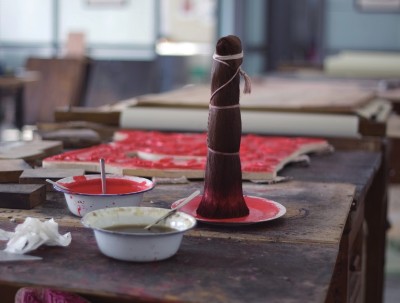 套印过程中的步骤,通常也是“学徒工”需要跟着师傅反复揣摩的步骤,现在社里的年轻人,大多是工艺美院快要毕业,开始实习的学生。他们经过内部的选拔,一些有版画基础或是资质良好的学生在社里跟着老师傅学做木刻画。刀刻手艺自不用说,那得经过长时间的苦练。一些看似毫不起眼的工序,更是马虎不得。套色板的“模版”和“牵纸”,也就是把色板和宣纸固定在制作好的梨木板上,光是模板的准头和牵纸线的手劲,就得练上好几百次才能过关。用鬃刷泼颜色刷板的时候,要做到画面上色彩的匀、准、洁、鲜,手腕的韧性就远不是几个月能练就的。