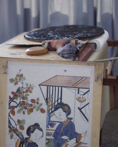 坐在一旁安心描墨线图、刻板的姑娘,手艺已经极为稳健。手上的几把工具,也在日复一日的使用中,手柄已被磨得溜光。在离开画社的时候,正逢午餐时间,这些还穿着蓝布褂当工作服的画社成员,一边手捧饭盒,一边嬉戏聊天,衣服上还留着刷色板时碰到的颜料。不由得想到唐伯虎那首被用来给桃花坞正名的《桃花庵歌》,其实还有一段更为人熟知的句子:“世人笑我太疯癫,我笑他人看不穿。不见五陵豪杰墓,无花无酒锄作田。”