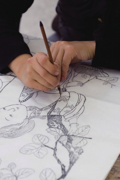 苏州工艺美院的苏州桃花坞年画社,相比于另一处位于苏州闹市的展示处,这里安静平和也更适合创作。画社门外的墙上,一边悬挂着郭沫若先生大笔挥就的社名木牌,展示着画社自创立以来的历史故事,另一侧墙上则悬挂着美院学生年选评奖的作品展示。走进“教室”,还在工作中的匠人师傅们只是稍微抬头看了看外人,便继续旁若无人地干着手上的活计。原本专攻国画的钱锦华社长在一旁介绍道:“这位房志达师傅今年已经八十二岁,他与另一位叶宝芬师傅都是我们这里的非物质文化传承人。其他都是我们的年轻有为的小学徒们。”