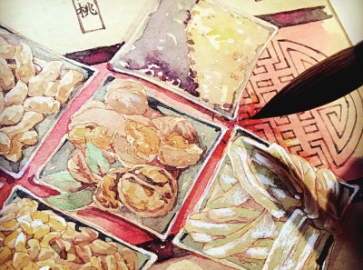 李晓林与她的先生相辉取两人的名字,成立了自己的工作室,名为“绘麟社”。“绘麟社”成立后第一个民俗系列“二十四节气美食图”,就让李晓林一下成名了。而如今,李晓林依然在自己深爱的民俗领域寻寻觅觅,用画笔与时间赛跑,记录下许多行走在消逝中的瞬间,“我喜欢做民俗也是因为它让我觉得踏实,这种安全感会让我越来越产生归属的感觉”,李晓林说。