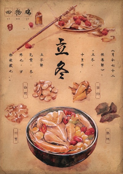 A:从氛围上,比如画大暑的节气美食米糟的时候,就会在食器下面画一把蒲扇。这些氛围的营造,绝对不会抢了米糟那一道主食,它是作为小氛围。 包括我们的配文,其实都是解说性的。绘画的时候,我会更多考虑如何把民俗或者故事讲明白。
