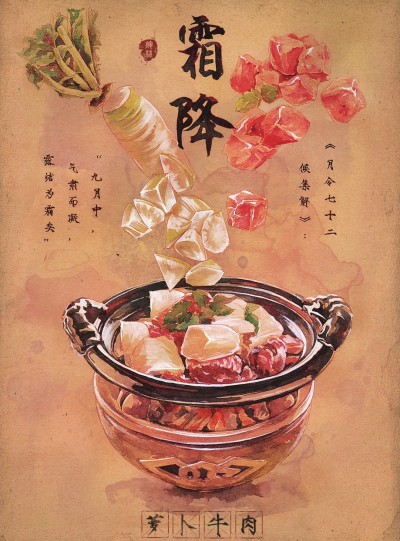而这种敬畏感在她开始“二十四节气美食图”系列之后,显得更加强烈。在做“24节气美食图”系列的过程中,她发现所有的节气与它们相对应的美食,几乎都有有趣淳朴而又不能更改的法则。比如,“霜降时节宜吃牛肉,是为进补。”“水土湿气凝而为露,秋属金,金色白,白者露之色而气始寒也。”刚刚过去的白露节气,在李晓林的“24节气美食”系列画中,以一杯白露酒的方式出现。《水经注》中记载“白露酒”时曾写道:“郴县有渌水,出县东侯公山西北,流而南屈注于耒,渭之程水溪,郡置酒馆酝于山下,名曰‘程酒’,献同也。”由于酿制的方法和节气都极为特别,这一杯“程酒”也就成了白露最好的代名词。