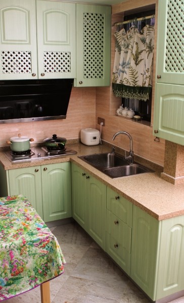厨房:和北欧风或日式家装相比,我家改造成了自己偏爱的美式乡村风,特点是复古。橱柜做了美式的,有格栅,为里头热水器通风散热,桌布、橱柜都统一成绿色调。我曾想把空调、洗衣机也换成绿色的,无奈实在难找,因此我最引以为傲的单品是复古绿款式的电水壶。厨房的瓷砖是从很多个品牌里挑的,辨别瓷砖优劣的点在于,好的瓷砖每一块纹理都不同。去建材市场挑选东西的时候,很多人不去判断适不适合自己的家,买回来才发现很多元素混在一起,风格偏差很多。