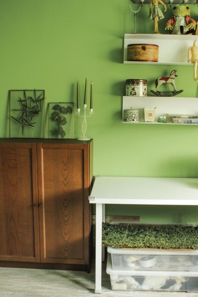 Shaysun喜欢绿色,住进一间绿色的房子是她一直以来的梦。因此,Shaysun对颜色的要求可是让上色的师傅伤了不少脑筋:“绿色有很多绿,有偏黄的,有偏蓝的,我想要饱和度低一点的绿。整间房可以是不一样的绿,但一定要在一个色域上。”为此,Shaysun曾经整个周末都在跑市场,为了将瓷砖间隙的填缝剂也做成绿色。这么折腾着家的时候,朋友都以为Shaysun要结婚了,她却自嘲:“就是因为知道自己这辈子嫁不出去了,所以才更要努力。”Shaysun家里有一个工作间,堆满了摄影器材和道具,这些都在提醒着她自己要坚持一名职业摄影师的梦想。而绿植标本、缝纫材料、爬行类宠物等家中的小风景亦都是她的兴趣点所在。“提升自己永远是最重要的。”Shaysun的家是滤镜风的,而生活就是把滤镜般的梦想变成现实。