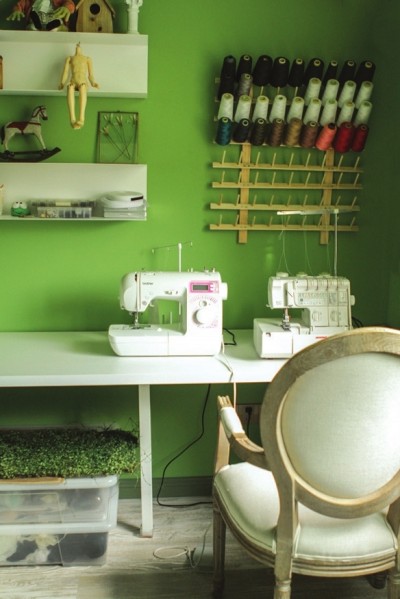 工作室:我又要做衣服又要拍照,就把一间卧室改造成了工作室。线架是在淘宝上找人定制的尺寸,另外还有两台缝纫机作工具,一台是拷边机,一台用来踩线。家里比较乱,确实是兴趣爱好太多了。拍照用的背景“护墙板”我也会自己做,自己上色。