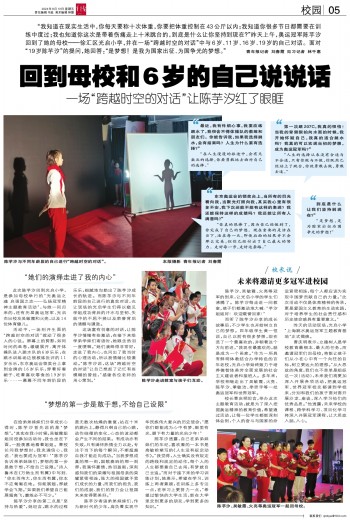 陈芋汐寄语弟弟妹妹们,作为新时代的少年,肩负着实现中华民族伟大复兴的历史使命,“愿你们都能成为心中有梦、眼里有光、脚下有力量的光启少年!”