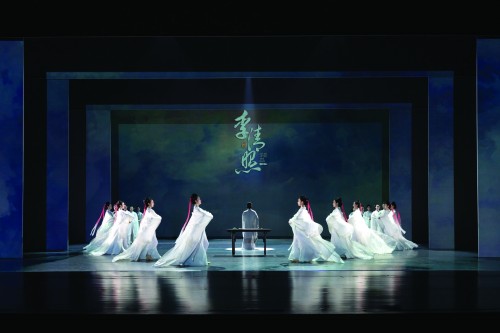 喻荣军阐述道:“《李清照》的视觉意象是以体现其诗词意境为总揽,以宋代美学审美为基础,既讲究形式美,也注重精神内涵和情感表达。例如,汝瓷的华润质感、宋锦的华丽色泽、精致图案以及坚柔质地,还有宋曲的清空文雅、平和淡泊,以此来形成舞台的整体视觉、听觉意象,呈现宋代的焚香、品茶、插花、挂画等生活方式与日常美学。”