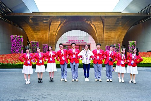 11月4日,志愿者在第七届中国国际进口博览会举办场地——国家会展中心(上海)合影。新华社 图