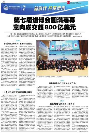 按一年计意向成交金额800.1亿美元,比上届增长2.0%,其中,上海交易团累计意向成交金额101亿美元,同比增长6.3%,连续7年位列地方交易团首位,第七届进博会11月10日在国家会展中心圆满落幕!