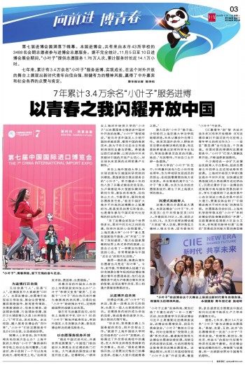 七年来,累计有3.4万余名“小叶子”服务进博、实现成长,在这个对外开放的舞台上展现出新时代青年自信自强、刚健有为的精神风貌,赢得了中外嘉宾和社会各界的点赞与肯定。