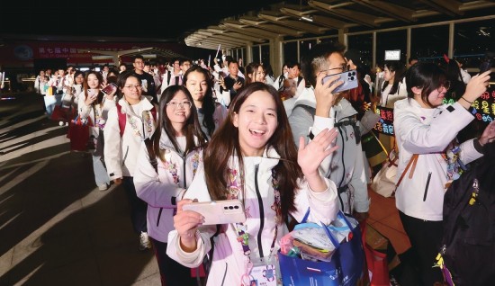 《年轻的力量》《夜空中最亮的星》《红日》《再见》……乐队现场演奏起“小叶子”们心爱的旋律,来自各校的“小叶子”们列队而过,他们挥手、击掌,荧光棒在空中摇曳生辉。“小叶子冲鸭”“致那些披星戴月的日子”……五彩斑斓的灯牌标语在国家会展中心东登录厅的天桥上闪烁。