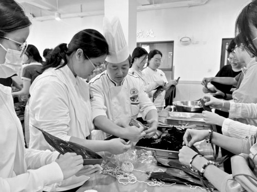 厨艺是独立生活必备的基础技能,也是劳动教育的一项重要课程内容。在传统中式面点厨艺教学中,学校食堂被开放给同学们“共享”,他们在食堂员工的指导下,学习包饺子、做包子、蒸烧卖、做麻球。学校大厨给学生一对一指导,大家不仅学习到了厨艺技能,也在结束后快乐品尝自己的劳动成果,还高兴地分享给老师、朋友。