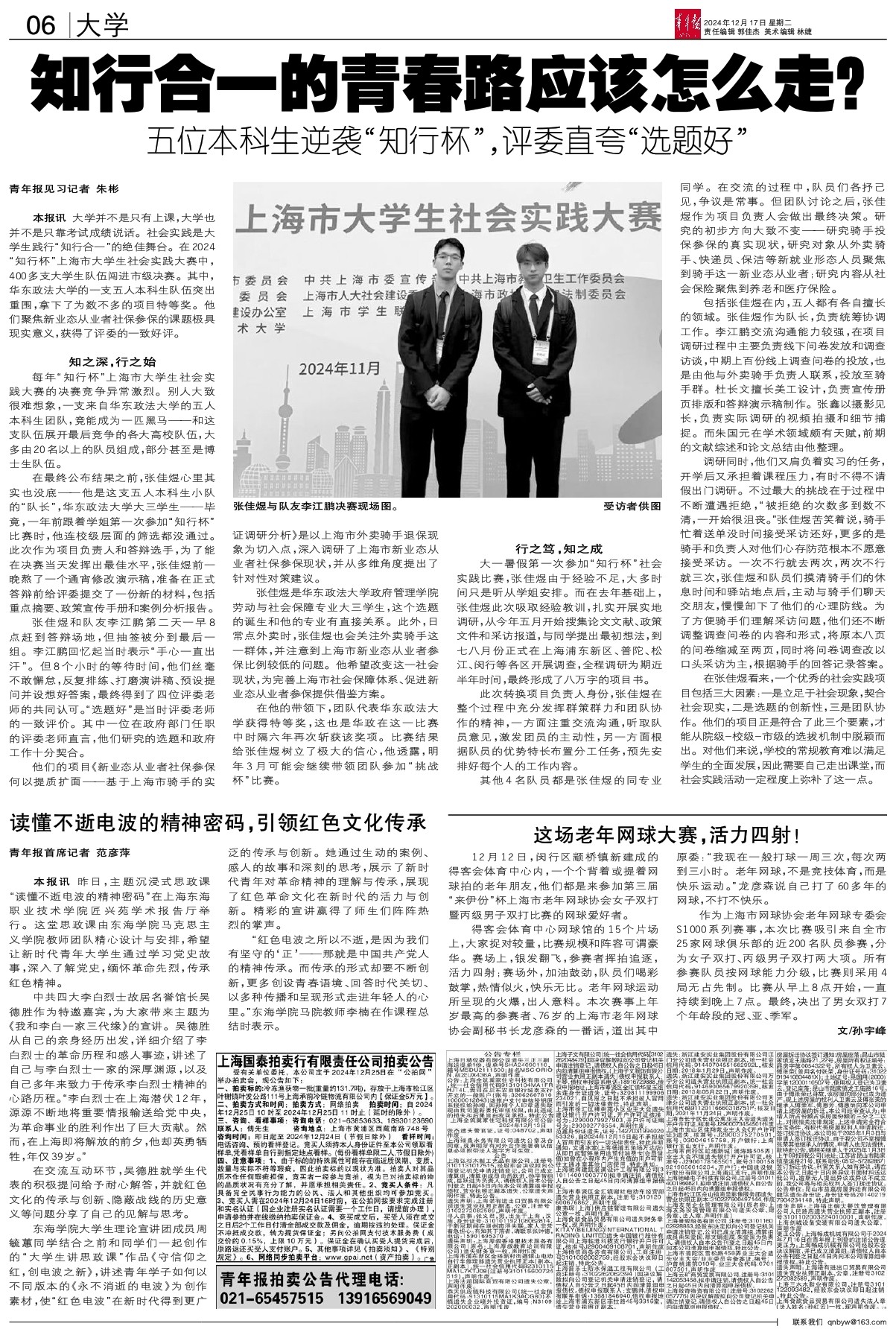 本报讯 大学并不是只有上课,大学也并不是只靠考试成绩说话。社会实践是大学生践行“知行合一”的绝佳舞台。在2024“知行杯”上海市大学生社会实践大赛中,400多支大学生队伍闯进市级决赛。其中,华东政法大学的一支五人本科生队伍突出重围,拿下了为数不多的项目特等奖。他们聚焦新业态从业者社保参保的课题极具现实意义,获得了评委的一致好评。