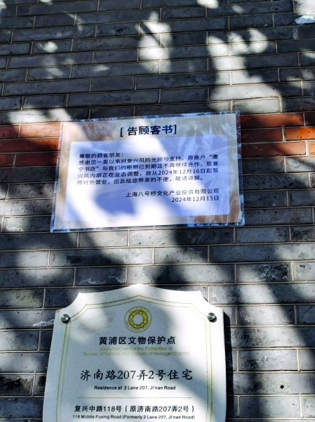 “我们营业到晚上8点,到时这里就结束了。所以放了留言册,给大家留个念想。”一名店员告诉记者。一张落款上海八号桥文化产业投资有限公司的“告顾客书”也端端正正地贴在进门的墙上。其中明确写了12月16日是这家书店的最后一天。