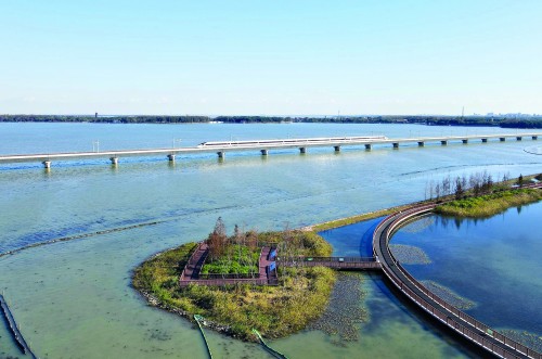 列车行驶在沪苏湖高铁青浦特大桥元荡段。新华社 图