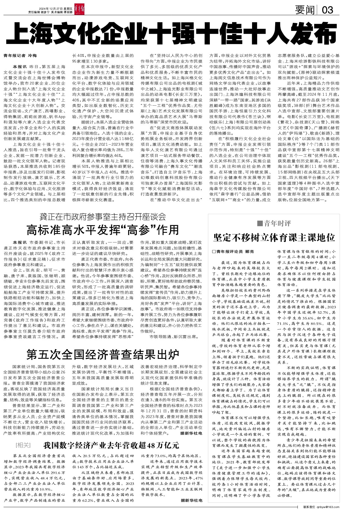 本报讯 昨日,第五届上海文化企业十强十佳十人发布仪式暨交流会在上海世博会博物馆举办,我市20家企业、20位企业人物分别入选“上海文化企业十强”“上海文化企业十佳”“上海文化企业十大年度人物”“上海文化企业十大创新人物”。交流会现场,文广演艺、西嘻影业、得物集团、莉莉丝游戏、帆书App和混知等六家入选企业代表交流发言,分享企业和个人的实践经验和思考,并对上海文化产业创新发展建言献策。