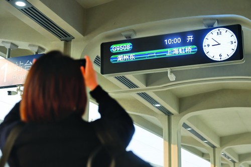 昨天9时45分,始发列车湖州东-上海虹桥G9508次从湖州东站开出。 本版摄影 青年报记者 施培琦