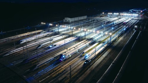 1月13日凌晨,完成检修的动车组列车停靠在贵阳北动车所内。新华社 图