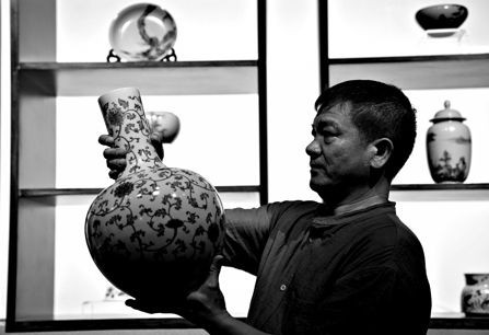 图为在江西景德镇,一位陶瓷匠人正在观赏瓷器。新华社 图
