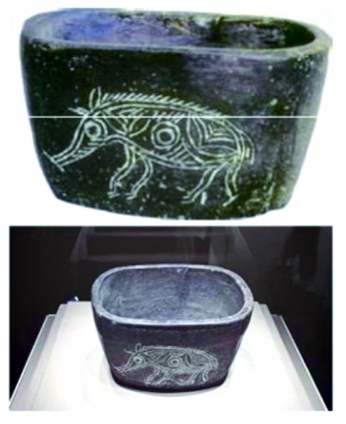 而“猪纹陶钵”则呈长方形,四角弧圆,平底,在钵外壁分别以写实的手法、均匀的线条刻绘了猪纹。整个猪的造型形态逼真,四足蹒跚而行,头向前垂,双目圆睁,似乎正在寻觅食物。“你可以发现,在中国,很早就开始有猪的纹样,这也证明了中华民族农耕文化的源远流长,这与文字也一脉相承,我们的‘家’字,就是屋檐下一只猪。纹样与文字一样,印证了中国人的社会生活。”沈沉说。