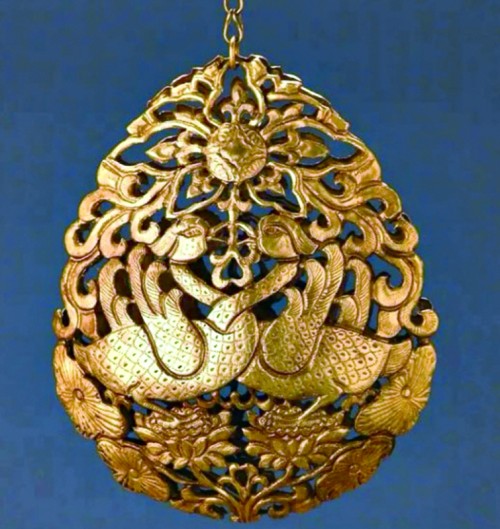 镂空莲池交颈鸳鸯纹带链金香囊(北宋)。