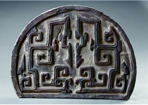 中国传统纹样也常见于建筑之上。比如夔纹大瓦当,出土于辽宁绥中姜女石建筑群石碑地遗址。瓦当上面刻画的高浮雕夔纹虽然已将夔龙简化,但蜷曲盘绕,两相对称,依然状如山峦,十分有气势。