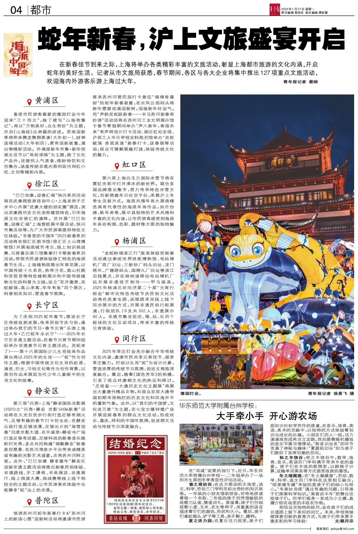 在新春佳节到来之际,上海将举办各类精彩丰富的文旅活动,彰显上海都市旅游的文化内涵,开启蛇年的美好生活。记者从市文旅局获悉,春节期间,各区与各大企业将集中推出127项重点文旅活动,欢迎海内外游客乐游上海过大年。