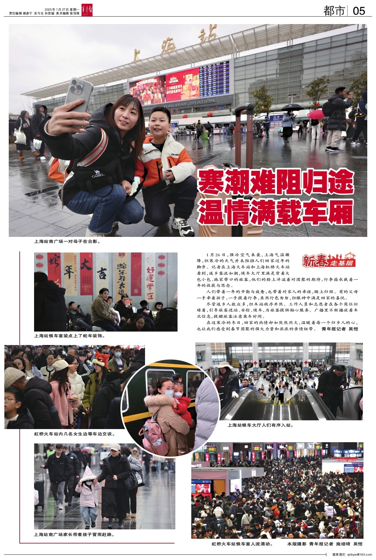 1月26日,强冷空气来袭,上海气温骤降,但寒冷的天气并未阻挡人们回家过年的脚步。记者在上海火车站和上海虹桥火车站看到,返乡客流如潮,候车大厅里满是背着大包小包、拖家带口的旅客,他们的脸上洋溢着对团聚的期待,行李箱承载着一年的收获与思念。