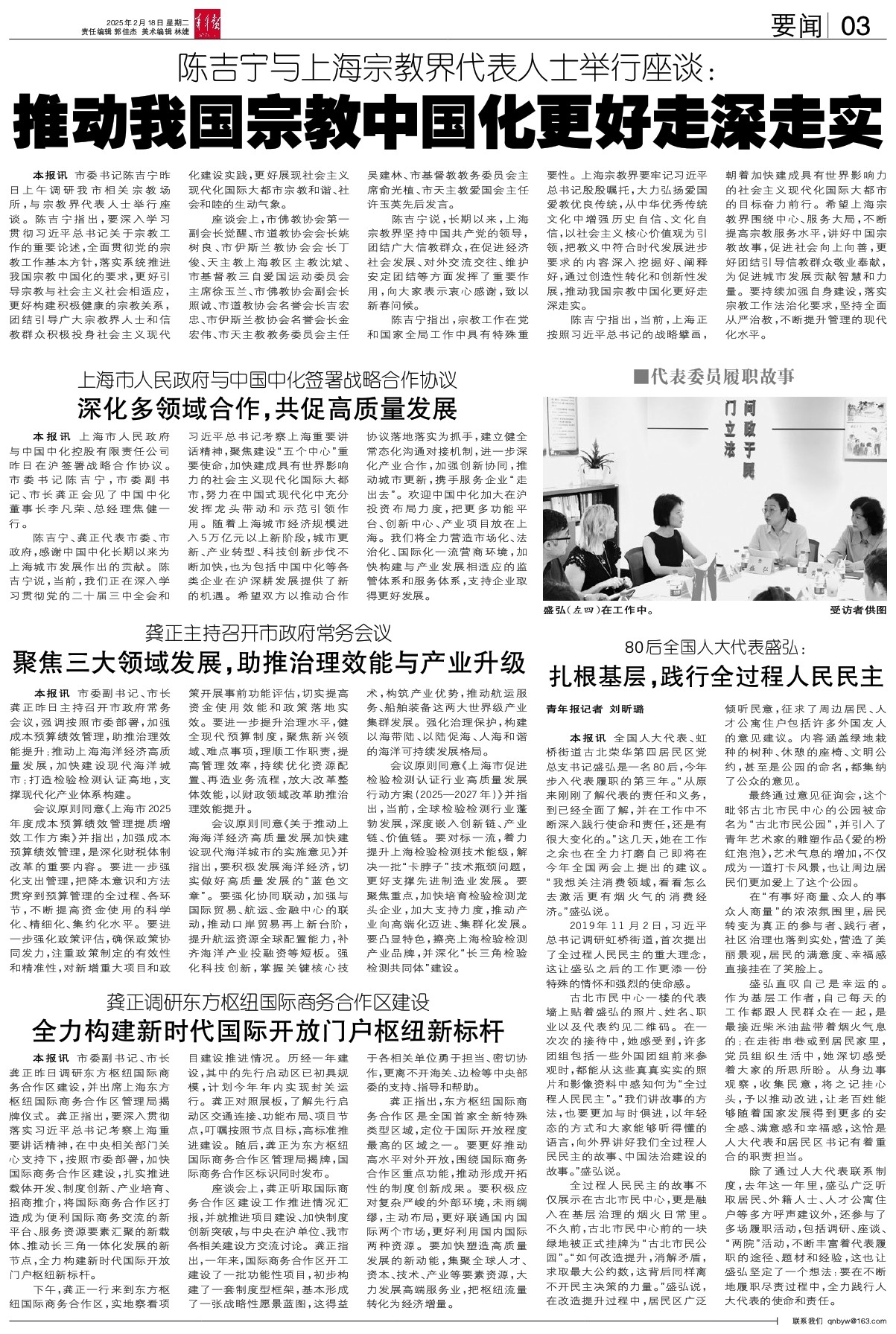 陈吉宁指出,宗教工作在党和国家全局工作中具有特殊重要性。上海宗教界要牢记习近平总书记殷殷嘱托,大力弘扬爱国爱教优良传统,从中华优秀传统文化中增强历史自信、文化自信,以社会主义核心价值观为引领,把教义中符合时代发展进步要求的内容深入挖掘好、阐释好,通过创造性转化和创新性发展,推动我国宗教中国化更好走深走实。