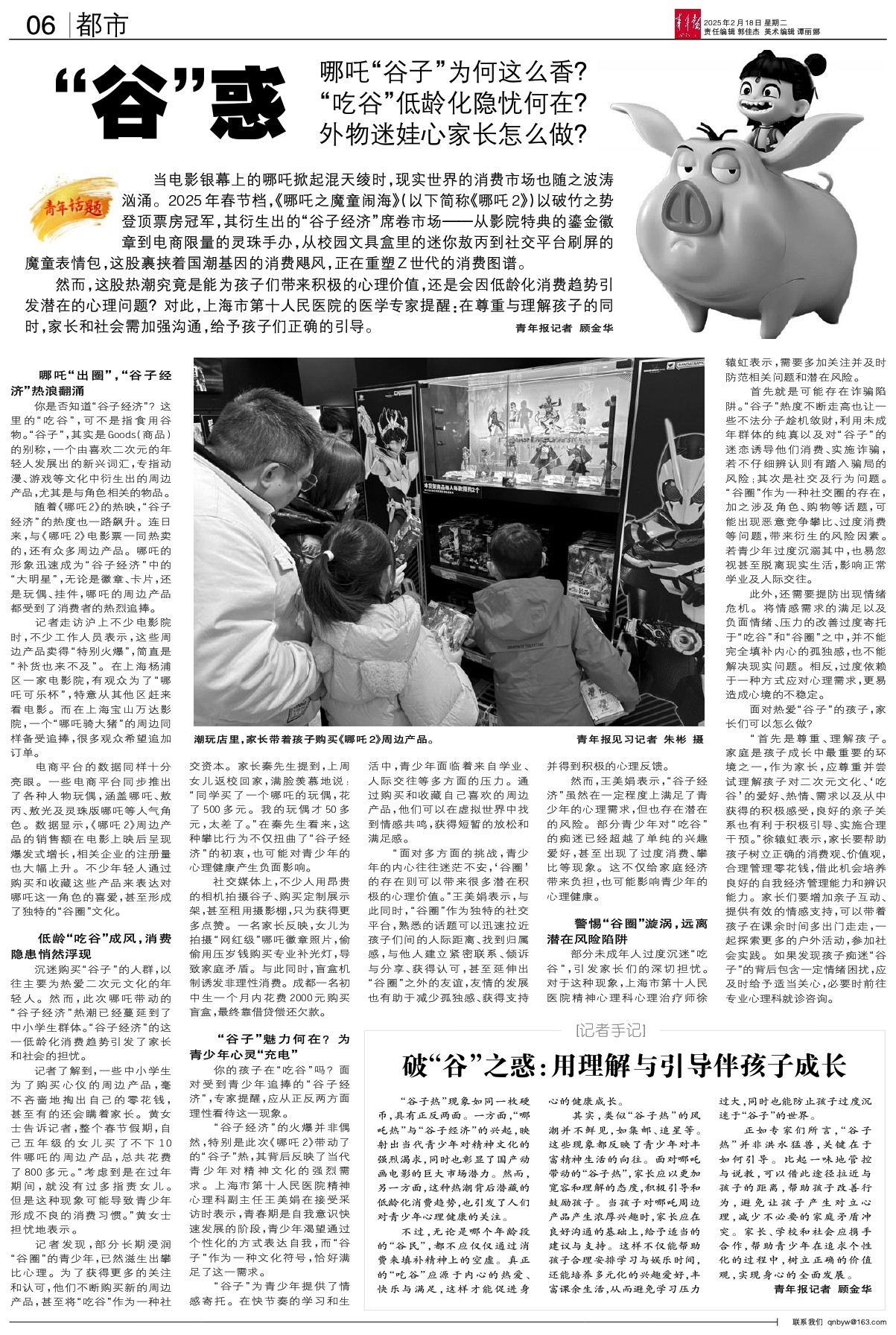 其实,类似“谷子热”的风潮并不鲜见,如集邮、追星等。这些现象都反映了青少年对丰富精神生活的向往。面对哪吒带动的“谷子热”,家长应以更加宽容和理解的态度,积极引导和鼓励孩子。当孩子对哪吒周边产品产生浓厚兴趣时,家长应在良好沟通的基础上,给予适当的建议与支持。这样不仅能帮助孩子合理安排学习与娱乐时间,还能培养多元化的兴趣爱好,丰富课余生活,从而避免学习压力过大,同时也能防止孩子过度沉迷于“谷子”的世界。