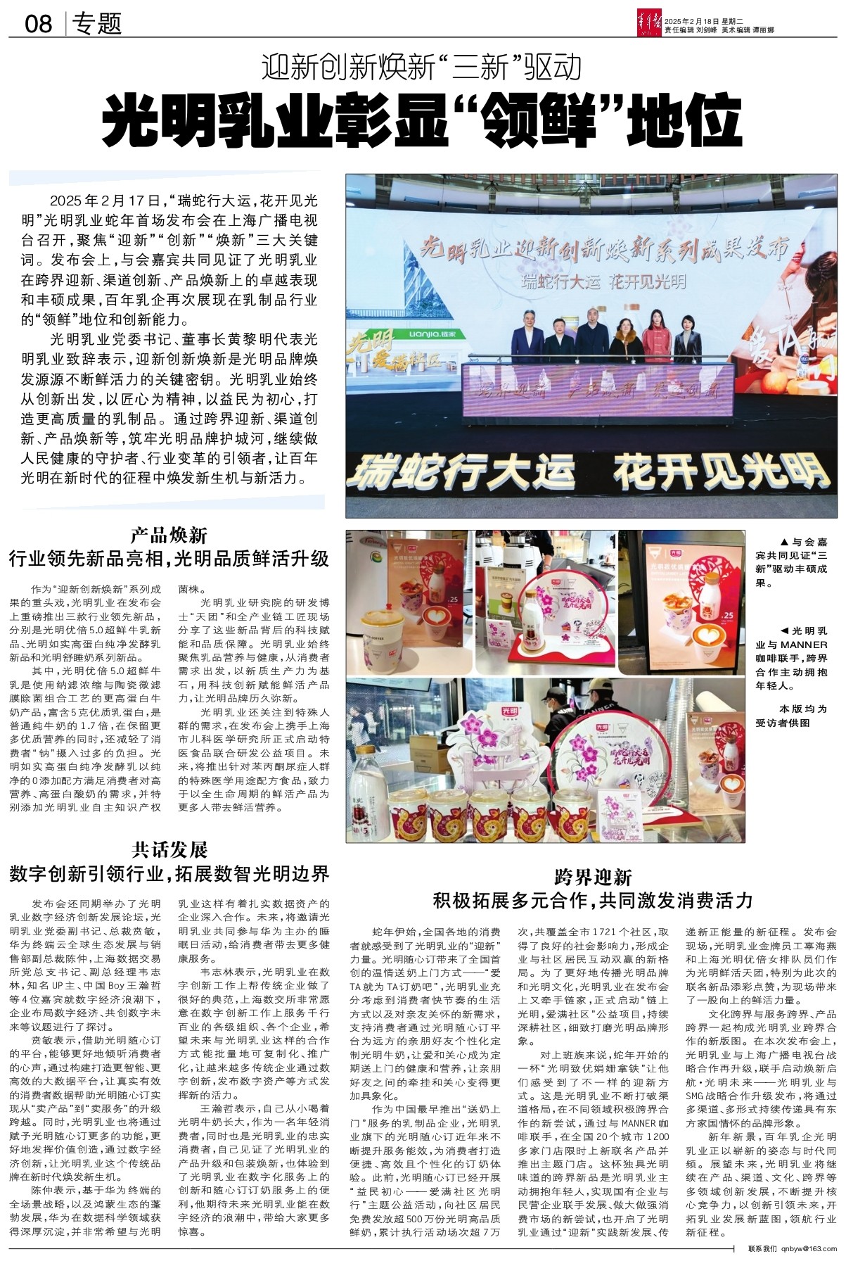 2025年2月17日,“瑞蛇行大运,花开见光明”光明乳业蛇年首场发布会在上海广播电视台召开,聚焦“迎新”“创新”“焕新”三大关键词。发布会上,与会嘉宾共同见证了光明乳业在跨界迎新、渠道创新、产品焕新上的卓越表现和丰硕成果,百年乳企再次展现在乳制品行业的“领鲜”地位和创新能力。