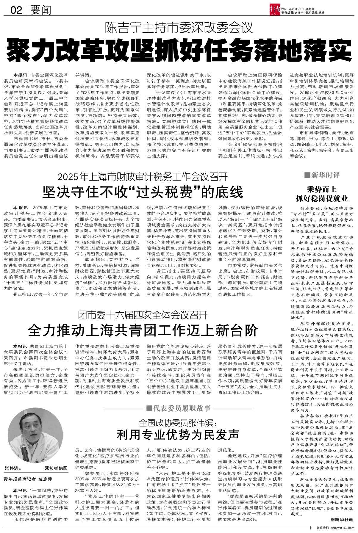 朱忠明指出,过去一年,全市各级团组织勇担使命、奋发有为,各方面工作取得新进展新成效。新一年,要深入学习贯彻习近平总书记关于青年工作的重要思想和考察上海重要讲话精神,胸怀大势大局,紧扣中心任务,找准主攻方向,紧紧围绕增强政治性先进性群众性、提高引领力组织力服务力,团结带领广大青年坚定信心、奋力一跳,为推动上海高质量发展和现代化建设贡献磅礴青春力量。更好引领青年思想进步,坚持不懈用党的创新理论凝心铸魂,善于用好上海丰富的红色资源和生动的改革开放实践,灵活运用各种载体方法,引导青年矢志不渝听党话、跟党走。更好组织青年接续奋斗,组织动员青年在“五个中心”建设中挺膺担当、在创新创造创业中勇挑重担、在人民城市建设中施展才干。更好服务青年成长成才,进一步拓展联系服务青年的覆盖面,千方百计帮助解决青年急难愁盼,打响更多服务品牌、形成集成效应。更好推进自身改革,全面从严管团治团,坚持实干导向、增强工作本领,高质量编制好青年发展“十五五”规划,全力推动上海共青团工作迈上新台阶。