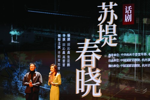 中国国家话剧院出品的《苏堤春晓》作为开台大戏在启幕仪式上亮相,国家话剧院一级演员辛柏青在剧中扮演苏轼,向媒体记者分享了创作感受。 青年报记者 施剑平 摄