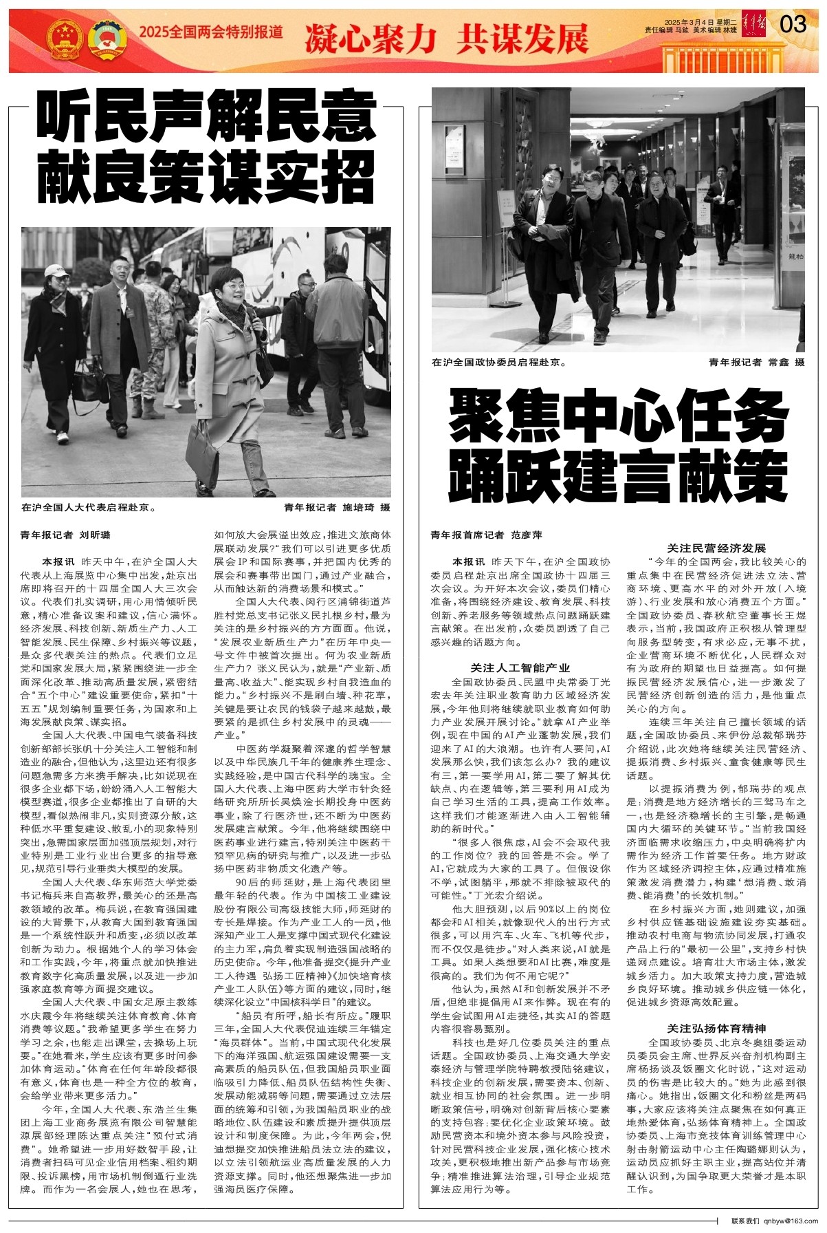 本报讯 昨天下午,在沪全国政协委员启程赴京出席全国政协十四届三次会议。为开好本次会议,委员们精心准备,将围绕经济建设、教育发展、科技创新、养老服务等领域热点问题踊跃建言献策。在出发前,众委员剧透了自己感兴趣的话题方向。