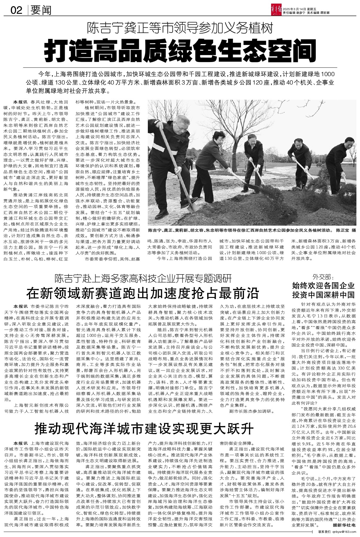 龚正指出,要聚焦重点抓突破,高质量推动现代海洋城市建设。要聚力推进上海国际航运中心建设,促改革、促转型、促联通。在系统集成、优化拓展上下更大功夫,整体谋划、协同推进重点改革任务,持续放大已有首创成果的示范引领效应,加快数字化、智能化、绿色化转型,持续提升上海港的国际连通度和运转效率。要聚力培育发展海洋新质生产力,提升海洋科技创新能力,打造海洋战略科技力量,掌握关键核心技术。推进现代海洋产业体系建设,持续强化海洋先进制造业硬实力,不断抢占价值链高端。持续提升海洋现代服务业竞争力,做足邮轮经济。同时,强化资金、人才、海洋空间资源等要素保障。要聚力推进海洋生态文明建设,加强海洋生态保护,强化近岸海域污染治理和海洋生态修复,加快构建陆海统筹、江海联动的一体化保护修复格局,提升海洋安全韧性,提升海洋灾害预报预警、应急处置能力,筑牢海洋灾害防御安全屏障。